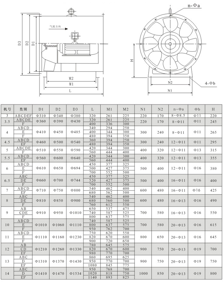 GXF系列斜流式通风机外形及安装尺寸(A、B、C、D、E、F型)